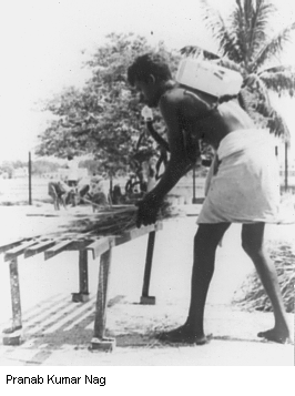 Lemploi de produits agrochimiques toxiques est particulièrement préoccupant, surtout en cas dapplication intensive dherbicides, de fongicides et dinsecticides. On peut être exposé aux dangers que présentent ces produits à de nombreux stades de la production agricole ainsi quau cours des opérations de conditionnement, de stockage, de transport, de distribution pour la vente au détail, dapplication (manuelle ou par voie aérienne), de recyclage ou délimination des déchets. Les risques sont aggravés par lanalphabétisme, un étiquetage insuffisant ou erroné, des récipients qui fuient, linsuffisance ou linexistence déquipements de protection individuelle adaptés, la modification de la formulation de ces produits, lignorance du danger, la non-observation des règles de sécurité ou labsence de supervision ou de formation technique. Les travailleurs devraient recevoir des instructions relatives à lutilisation de ces produits et porter un équipement de protection individuelle, règle difficile à imposer sous les tropiques dans la mesure où le port de cet équipement peut accentuer la contrainte thermique (voir figure 64.4). On devrait sefforcer de trouver et dutiliser des produits de substitution moins toxiques.